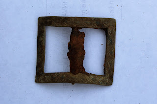 Here are the first finds which came from the spoil during stripping. Well done Caroline for having a sharp eye. I'm not a pot expert, but I suggest that one piece is probably Bronze Age, one or two Iron Age and one or two Roman. The buckle was found by Colin in the natural silty clay, which is very rocky. How that got there is anyone's guess. [update: the buckle was there because it was in a fill created by quarrying! Mystery solved.]